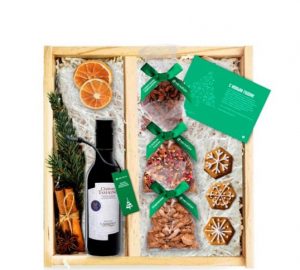 - Элементы брендирования: открытка (рецепт Глинтвейна с обратной стороны), бирка для вина, атласная лента